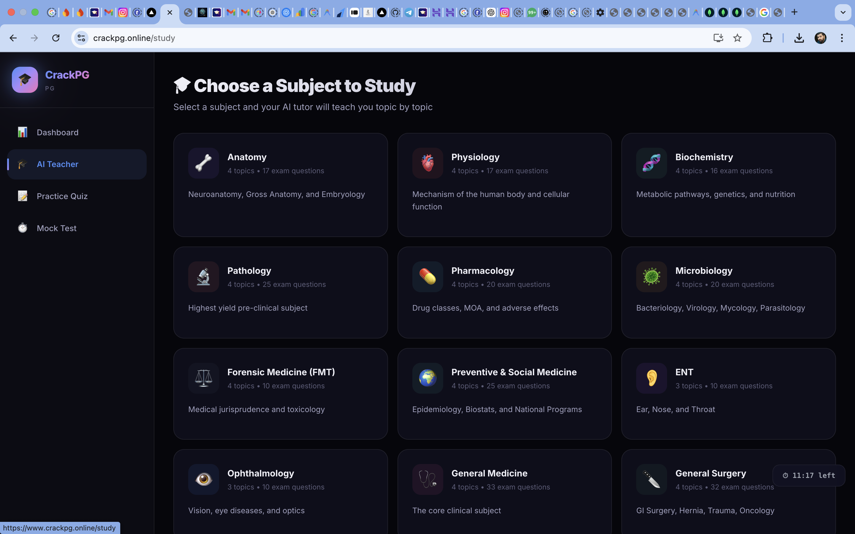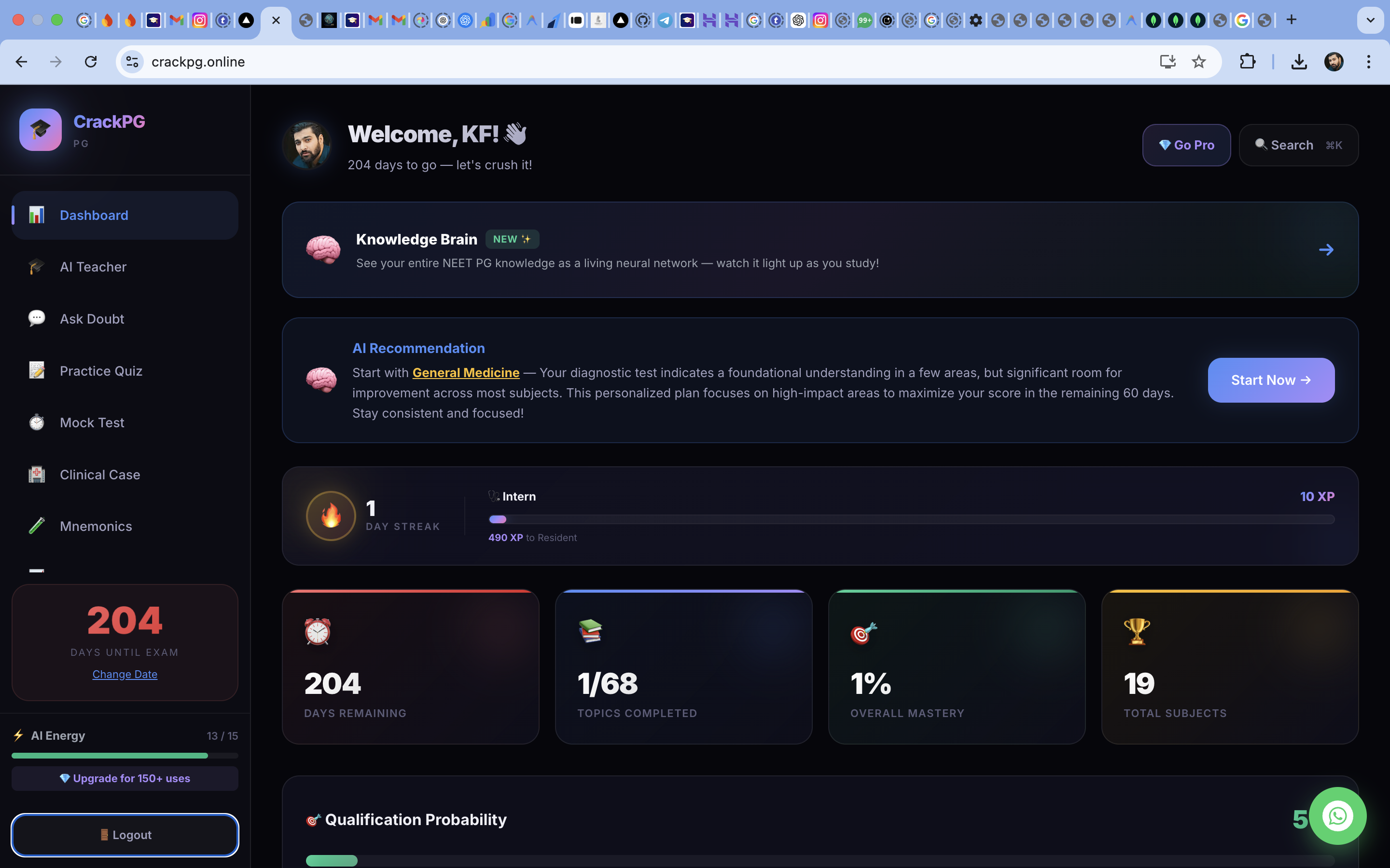 I built CrackPG to democratize preparation. I wanted to give every single medical aspirant access to an elite AI tutor that never sleeps, clinical cases that feel real, and an exam engine that actually predicts your rank. Technology should level the playing field, and that's exactly what we've done here.”