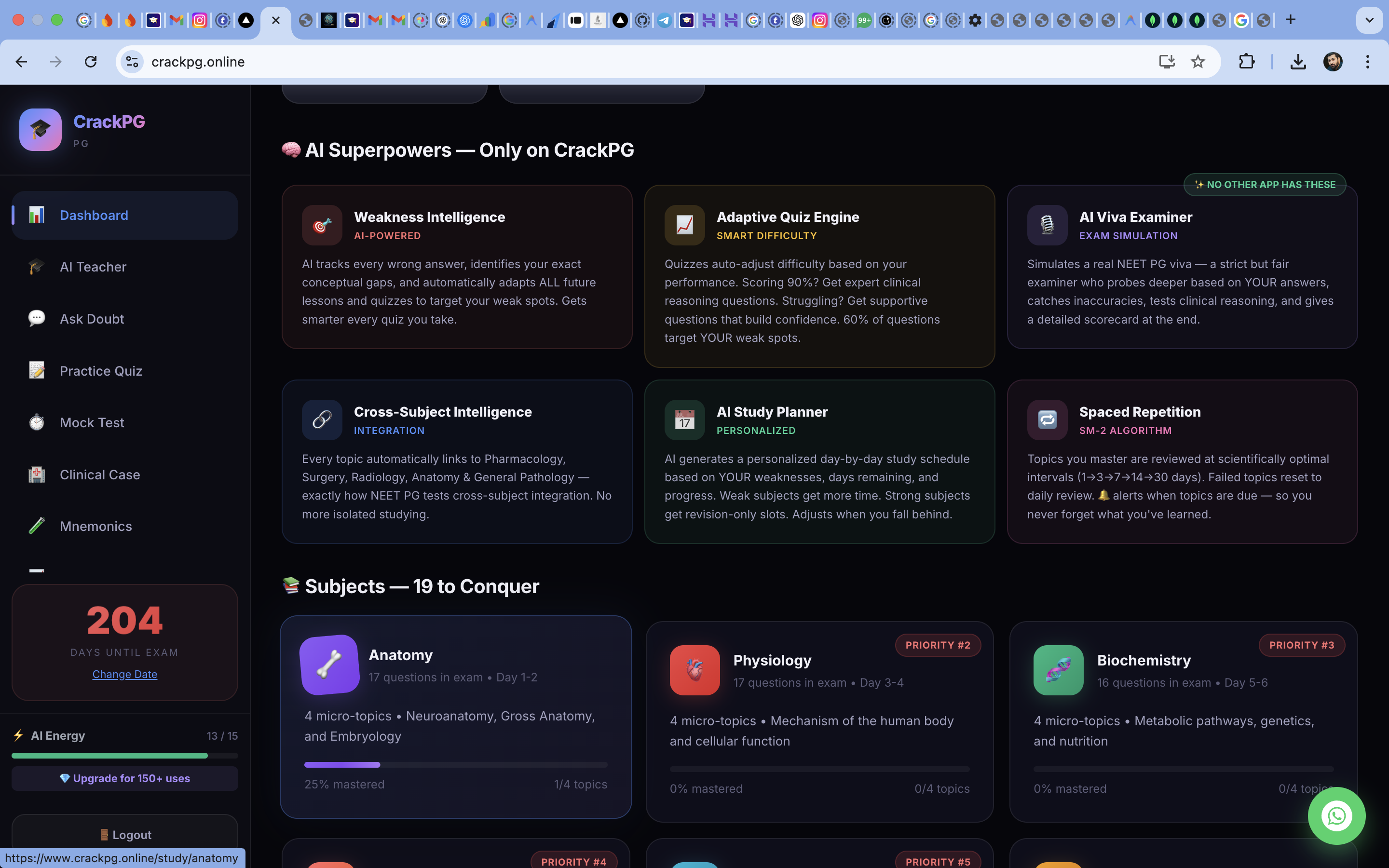 The most advanced AI study platform for NEET PG. Master 19 subjects, 950+ topics, with an AI teacher that never sleeps.